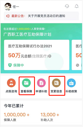 步骤二:通过公众号菜单,职工进入互助管理系统职工端首页,点击【查看保障】按钮或者【变更信息】按钮(图11-2)。