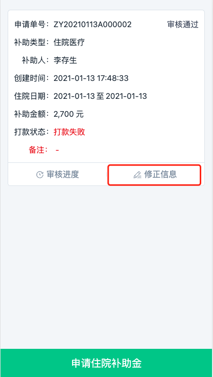 步骤六:等待经办端审批通过;如经办端因信息不对进行了驳回,对于驳回的信息,点击【修改】链接(图10-9),可进行修改,修改后可重新提交。如经办端因打款失败进行了驳回,点击【修正信息】链接(图10-10),可以进行银行卡修改,修改后可重新提交。如果经办端审批通过,则直接办结成功,无需处理,点击【审核进度】链接,可以查看审批结果。