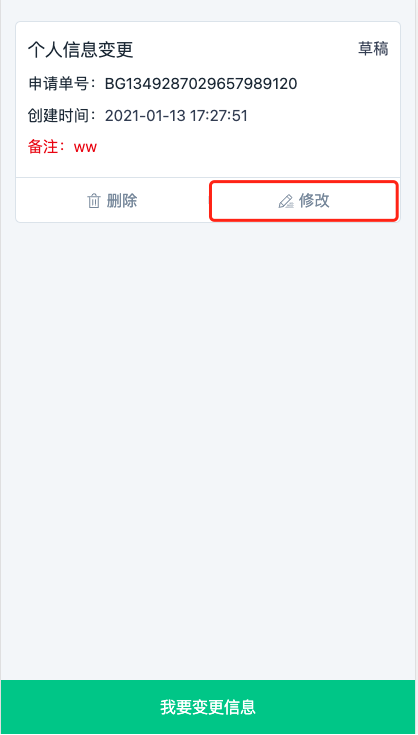 步骤四:进入变更单页(图11-4),点击【我要变更信息】按钮。
