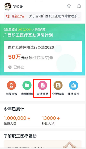 步骤二:通过公众号菜单,职工进入互助管理系统职工端首页,点击【申请补助】按钮